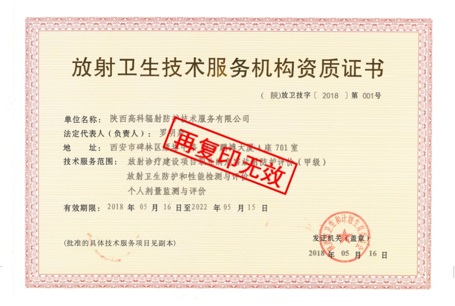 公司于2007年1月经陕西省卫生厅资质认证取得“放射卫生技术服务机构资质证书”,于2014年12月经陕西省安全生产监督管理局认证取得“职业卫生技术服务机构资质证书”。2018年5月取得放射卫生甲级资质。 2021年取得检验检测机构资质认证证书(CMA)。